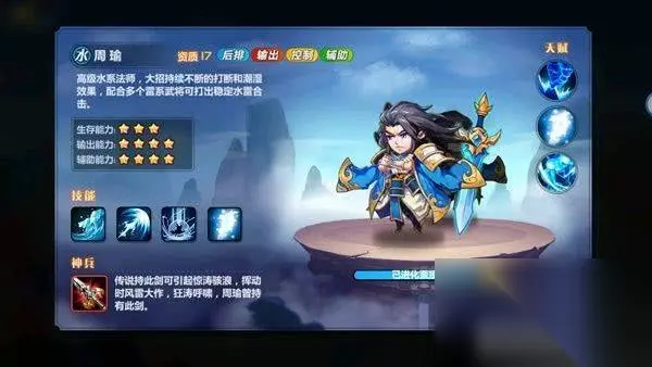 周瑜:目前水系武将大部分都是用来作为辅助雷系武将,而周瑜不单单能辅助,自身输出很不低,而且出场便带光环“英姿”提升我发全体武将的物理防御,“水盾”为我方力量最高的施加一个物理防御盾,大招“惊涛骇浪”除了能对目标施加潮湿状态外,还能打断对方攻击造成伤害。