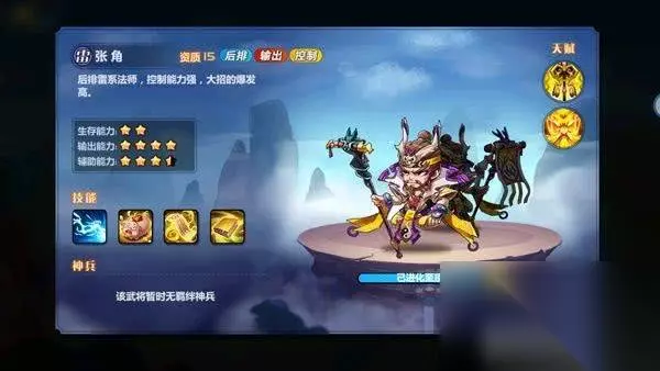 张角:张角输出能力可能不高,但是辅助能力却是极强,“偷天换日”随机将敌方一个武将变为小猪,“蛊惑人心”控制敌方最近一名武将,使其攻击自己同伴,这相当于有张角的队伍就是七个打3个啦。