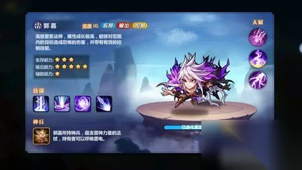 郭嘉:作为雷系法系输出,“三寸雷”随机禁锢一名敌方武将,“惊雷闪”造成范围雷系伤害,如若目标处于潮湿状态,额外增加暴击率,“国裂”为自身增加暴击率,所以郭嘉本身就自带较高的暴击率,成型较为简单。