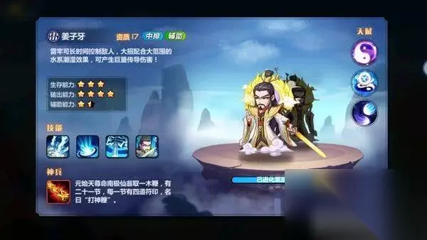 二、【水雷阵容推荐】 1.低配:紫霞仙子+郭嘉+甄姬+张角+孙坚(15资质*2+16资质*3) 2.中配:紫霞仙子+郭嘉+甄姬+周瑜+诸葛亮(15资质*1+16资质*2+17资质*2) 3.高配:武田信玄+姜子牙+甄姬+周瑜+诸葛亮(15资质*1+17资质*4) 三、【水雷阵容核心武将介绍】 姜子牙:站在雷系巅峰的武将,成型后的爆发输出超一线,小技能“雷牢”可长时间控制敌方物理攻击最高的敌人,相当于一个小技能限制了敌方一个高输出武将;“封神”光环提升我方全体武将的法术伤害。大招“引天雷”为高爆发技能,如若目标处于潮湿状态,几乎可以瞬秒对面武将,而且死亡后还能触发一次大招。