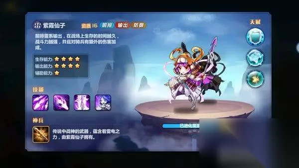 紫霞:前排雷系神将,能打能抗,目标处于潮湿状态,大招可能会直接一套带走一个武将,“雷光阵”是核心技能,控制对面智力最高武将,一般智力武将都是输出或奶,这样能很好的限制对方阵容,“女武神”可让紫霞攻击力一直提升。