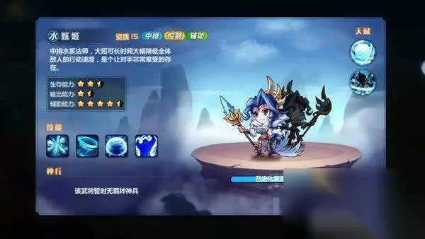 甄姬:大招“流风回雪”将对面全体武将减速并且附加潮湿状态,为雷系武将创造非常好的输出空间,穿戴皮肤后持续时间较长;“雪漫卷”随机冰冻一名敌人,“冰甲”为我发百分比血量最低武将施加冰甲,攻击该武将的目标会被减速;开场光环“冰美人”为我方全体武将增加物理防御。