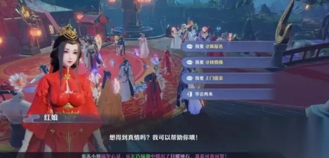 寻缘:玩家们需要到红娘处报名征婚 提亲:提亲者为男性角色,仅可以向亲密度≥1000的成女提亲 迎亲:河阳城月老祠寻找NPC“司仪”进行。