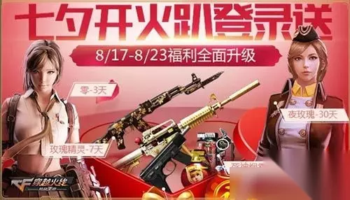 CF手游2020七夕节活动大全 七夕登录有礼 顶级神器一秒获取 七夕,就是够浪漫!CF手游七夕开火趴福利第一重惊喜,极具浪漫色彩的顶级神器诚意奉送!即日起至8月21日,玩家登录游戏就能100%领取夜玫瑰-2017、零、M4A1-玫瑰精灵、女神手雷和CZ75五件道具。一口气奉送五件超人气道具,可谓是前所未有的重磅福利,玩家们千万不要错过。 持续登录有礼海量豪礼诚意奉送 五件套只是开始,七夕浪漫不绝于此!CF手游七夕开火趴福利活动第二重惊喜,海量钻石、英雄级武器诚意奉送!即日起至8月23日,玩家游戏每日登录游戏还能100%获得超人气武器;每日奉送一组道具,连续7天款款不同,海量人气英雄级满足玩家每日换枪开火的需求。此外,玩家们还能同时领取海量钻石和精通点奖励。更让人惊喜的是,玩家在今日登陆游戏还能额外领取5天火线福袋,从七夕开始享受最惊喜的开火之旅。 限时开火有礼 全民100%翻到金卡 海量金卡从天而降,是CF手游七夕开火趴福利活动的第三重惊喜。8月18日(0:00-23:30),玩家参与重返巨人城任意难度,即可100%翻到金卡!由于金卡价值极高,该福利活动只展开1天,玩家们要把握好机会,尽可能获取最多数量的金卡。 七夕诚意回馈 三重福利组团登场 CF手游七夕开火趴福利活动的压轴惊喜,就是一口气推出三大福利活动。即日起至8月21日,玩家充值将能享受额外惊喜大奖海量钥匙,钻石尊享礼包,更有机会抽取8880钻!与此同时,玩家累计充值,还能获得王力宏角色、各式高级枪焰、光效以及玩偶,更有机会抽取永久英雄级武器! 更让人惊喜的是,即日起至8月21日,商城王者礼包限时8折,钻石礼包 更新上架M4A1-黑龙、剑齿虎、马来剑-毁灭。商城限时上架AN94-超新星直购宝箱,巴雷特-极光宝箱也已惊喜返场。此外,剑齿虎、M14EBR-暗夜还将以历史最低折扣开售!想要获得这些宝箱的玩家,务必在8月21日前抢购。 七夕佳节,就来CF手游七夕开火趴寻找你的奇妙缘分吧顶级神器、大量钻石、满屏金卡和海量豪礼等待着每位玩家前来获取。即刻起登录游戏,还有更多神秘惊喜等待着你来发现。