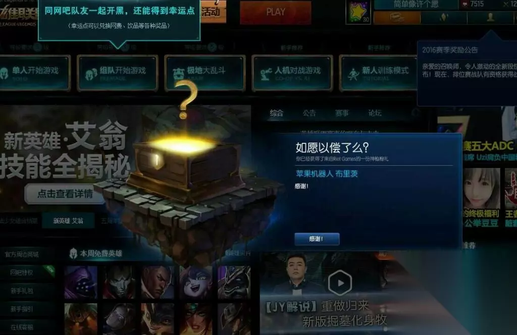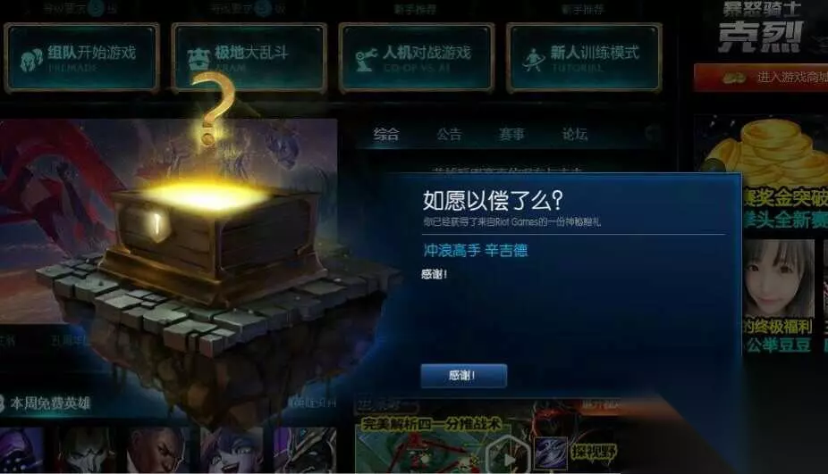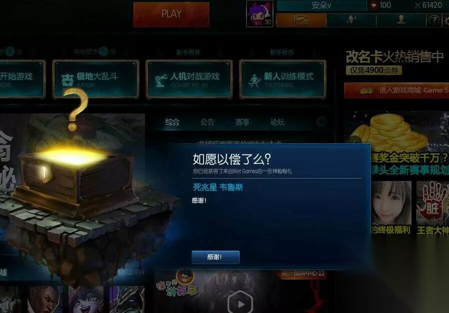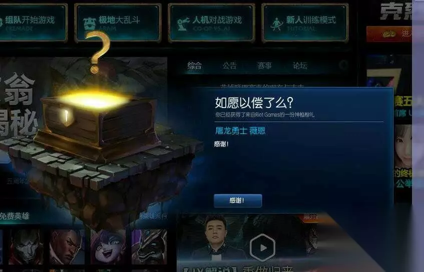 在相关论坛中,看到有人说还有神秘礼物是绝版皮肤瑞兹的至死不渝,不过没有晒出来。 小编的神秘礼物还没有出现,坐等中。。。。 你领到了什么什么神秘礼物?在评论中晒出来,装一波!