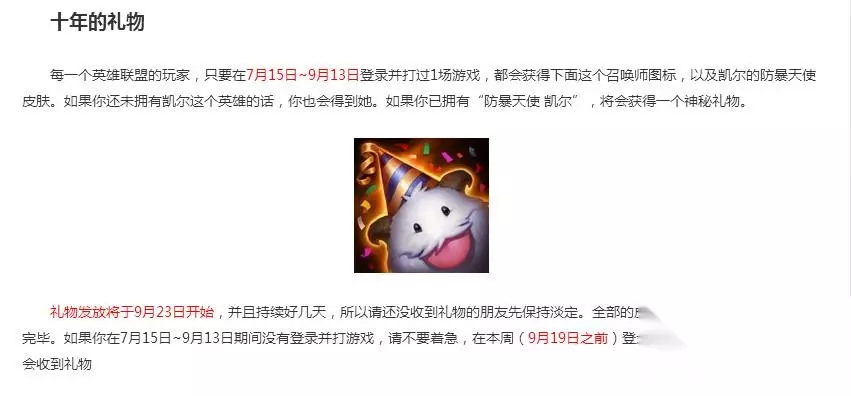 LOL英雄联盟十年礼物,已经于9月23日开始发放,没有领过防爆天使的,只能领这个皮肤和头像。以前领过防爆天使的小伙伴们都有神秘礼物哦。 这次的神秘礼物可不一般,每个人的礼物都可能不同,腾讯这次下了血本! 一起看看其他玩家领到的神秘礼物是什么吧!