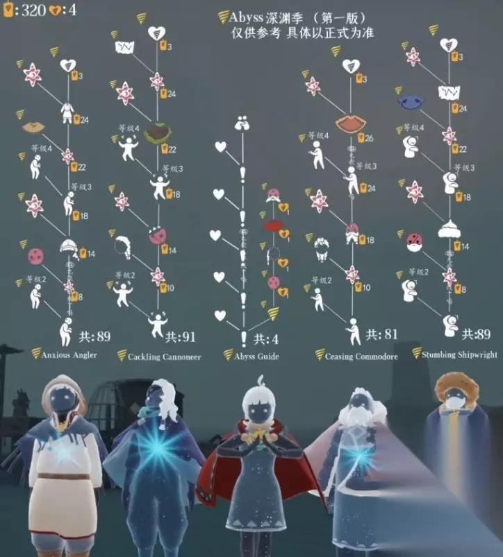 潜海季先祖兑换图: 潜海季的装扮偏向渔民风,季节装扮有:裤子*1,面具*6,发型*3,头饰*2,斗篷*5,其中四件毕业礼,毕业礼中潜水面罩可以增加玩家的潜水时长。