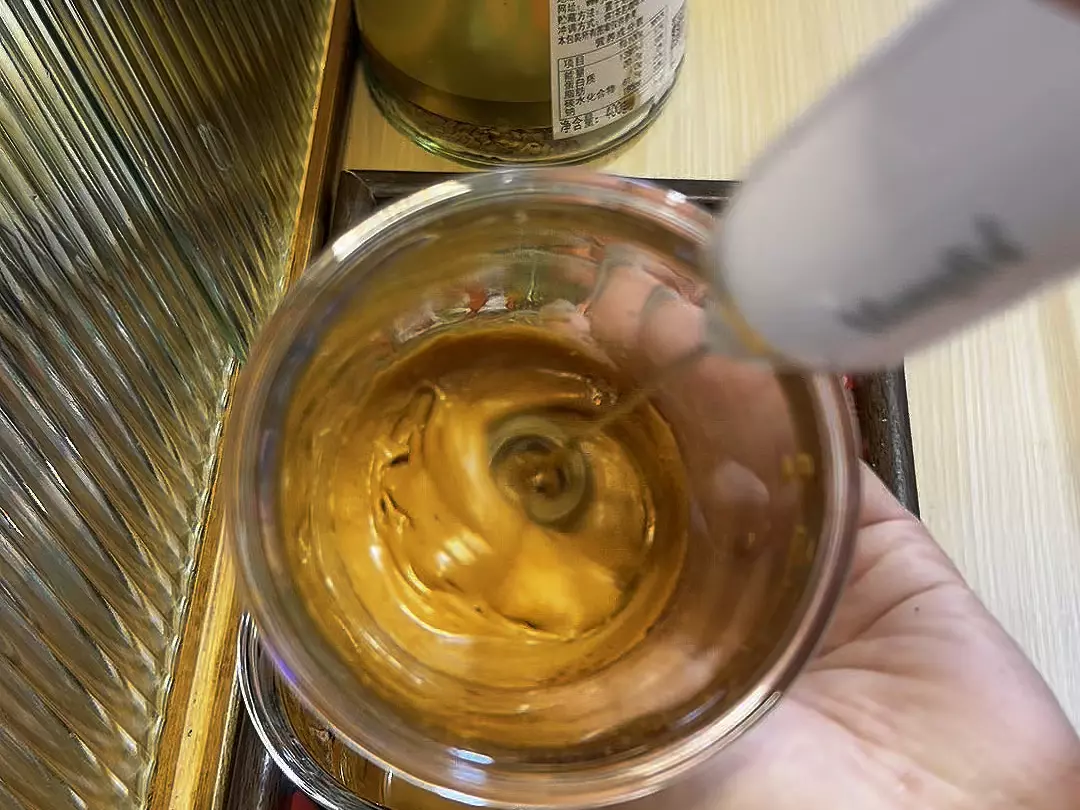 这是一则网红400次咖啡的美食教程,展示用7块9的搅拌棒,搭配咖啡粉、55度温水制作不加糖版400次咖啡,能打出可倒扣挂壁的泡沫,成品口感佳,呼吁大家尝试。