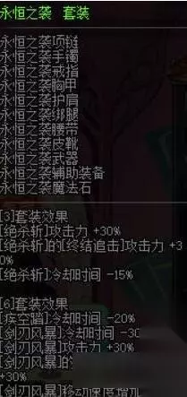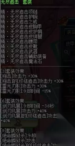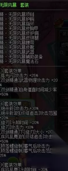 有了匕首套,自然也就有双剑套,无限风暴套就是强化双剑精通的套装,而且无限风暴套的技能加成比冰目套好不少,可惜的是不加成瞬狱,所以也并不怎么推荐 无尽追击套