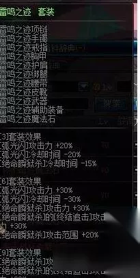 刺客目前最好的套装,没有之一,虽然三件套效果不好,但是6件和9件强力加成死亡风暴,这使得对上体型较大的BOSS的情况下,永恒之袭套装可以发挥出极强的杀伤力 雷鸣之迹套