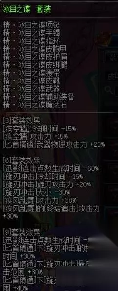 冰目套是匕首精通强化,但是由于刺客匕首精通的改动,9件套旋刃冲击不会有最后一击,而且过于强化疾风,使得其它技能伤害并不高,所以不推荐 无限风暴套装