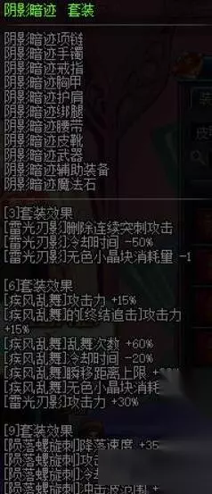 阴影暗迹套装主要加点在60和70EX技能上,但是刺客的60EX和70EX伤害并不算最高,而且对其它技能的加成不高,所以这套远古三套装也并不怎么合用 永恒之袭套