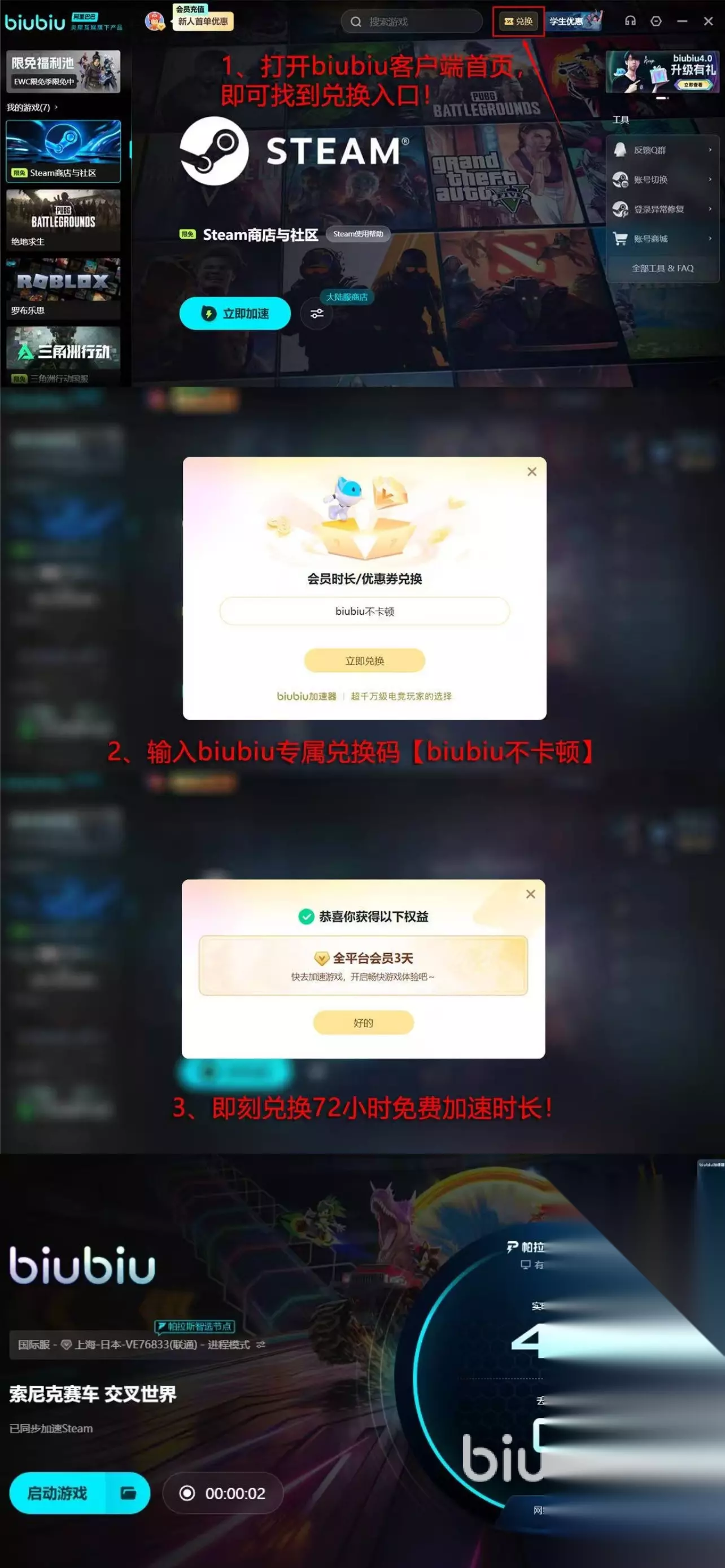 由于该作品是以竞速模式为主,所以建议大家搭配适合的提速器,比如上方链接提供的biubiu,对首次使用该平台的用户提供了不少福利,比如新人注册可得24h免费试用机会,同时平台还给全体用户额外提供三日体验时长,大家只需在兑换处输入【biubiu不卡顿】即可轻松获取。