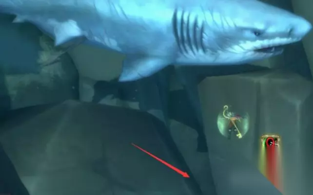 10、六号宝珠在盾憩岛飞行点左上方半沉没的雕像下面,可以看到一只没牙的大白鲨,下方就是洞穴。