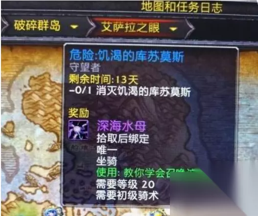 魔兽世界深海水母坐骑怎么获得 获得方法: 需要玩家接取世界任务才可以获得,进入游戏后需要玩家刷出消灭饥渴的库苏莫斯世界任务,而任务奖励就是深海水母坐骑,需要注意的是奖励深海水母的任务为两周一刷,所以错过一次要等半个月后才会再次刷新。