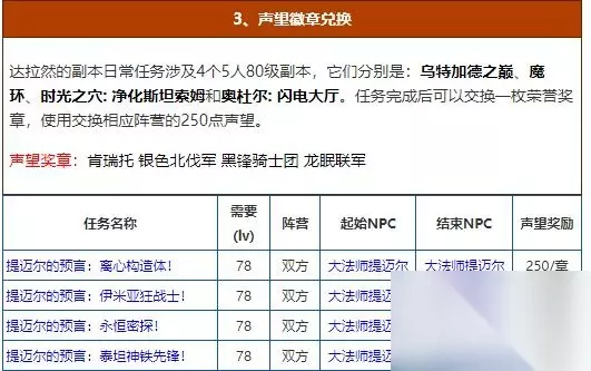 达拉然的副本日常任务涉及4个5人80级副本,它们分别是:乌特加德之巅、魔环、时光之穴: 净化斯坦索姆和奥杜尔: 闪电大厅。任务完成后可以交换一枚荣誉奖章,使用交换相应阵营的250点声望。