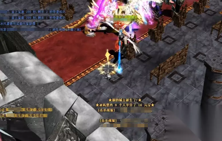 每座城门之后都有几个守护石像,石像后有可以获得的加成,例如灵魂药水和加速药水等等。当所有石像被打破后,攻方就能进入龙塔,其中两个机关右上角有刻录点,当同联盟中的两个人分别踩住机关时则视为刻录成功,同时还需要盟主刻录印记,但这时这三名人员都不能受到攻击,否则视为失败刻录。当一方刻录成功后,攻守方会瞬间交易位置,继续开启新一轮的攻守。当时间来到晚间八点三十分,攻城结束时,谁最后刻录成功谁就获得了胜利。