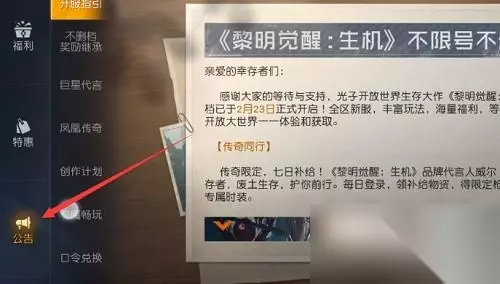 黎明觉醒活力兑换码在哪儿输入?有很多小伙伴也没找到兑换码的输入入口,现在就给你带来有关的输入方式,我们可以通过今天的文章来了解一下,帮助自己更加好的进行手机游戏的感受,领到更多精彩的福利具体内容。赶快来了解一下吧。 兑换码输入方式: 福利->公示->礼包兑换码 1、首先我们自己的级别必须升至10级,才可以领兑换码,到10级点击右上的【福利】。