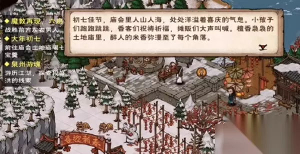 烟雨江湖大年初七任务攻略 在烟雨江湖中近期上线了庆祝新年的系列支线任务,而在今天开放了新的阶段“大年初七”。 这个任务要求玩家将小纸人送给洛阳城的客人们,而具体的送小纸人的目标则需要玩家根据线索来推理分析得出。 玩家们首先要在莫掌柜处选择初七快乐,来触发这个任务,领取到活动道具小纸人,总共需要玩家送3个小纸人。