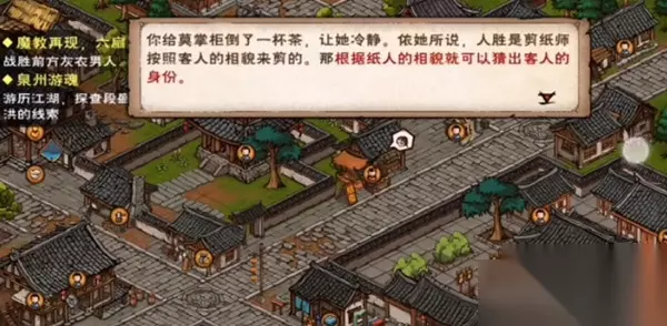 1、小纸人一:头戴白花——烟波楼 水仙 2、小纸人二:头戴蓝色玉坠——活动大使旁的江湖地质录作者 徐行芝 3、小纸人三:头戴珠花——洛阳镖局万夫人 玩家们参考上面给出的答案来将小纸人送给目标NPC,回去找莫掌柜,然后根据指引前往庙会喝七宝羮,而后获得沉香,点燃后即可进行许愿,最后欣赏完烟花,就算完成任务。