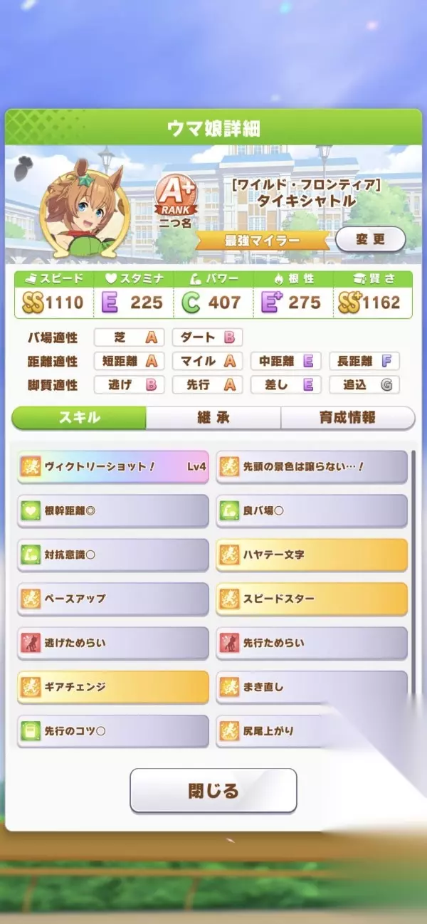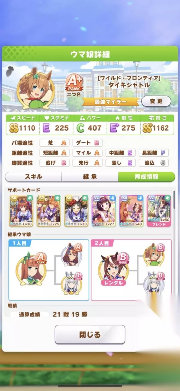 利用6张贤属性读书额外体力恢复与友情支援循环利用,可以很快达到贤属SS 方法介绍: 一开始就不管属性,只顾人头数量(选多的) 顾到人头量表到达橘色(第4~5格左右?) 开始出现支援效果(也就是彩虹) 有就点彩虹(❗有重要技能也可以,但彩虹优先度较高) 当贤属性到达1100(也就是SS级)就开始忽略彩虹 开始疯狂打比赛,没体力就休息,有体力但打不了就去补其他属性 重要关键: 这个方式会有大量技能点数 必须非常严谨选择技能 (毕竟只有贤属最高,其他属性很平均) 中、长赛道就 恢复技能 优先 短、マイル就 加速技能 优先 当以上技能大致都完成时 开始疯狂点 debff 技能 (也就是我们素质不好,那把别人素质变更低就好) 缺点介绍: 1.支援卡的六位角色没办法用(没替代卡QQ) 2.找好继承的技能变得很重要(也就是养好父母) 3.满贤属只要她不爽还是有可能不放(真赌马) 养出A+的经验参考: 首先上图