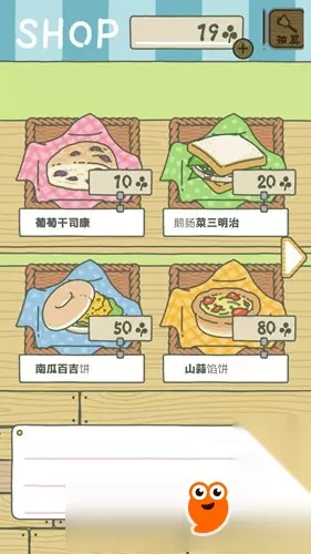 有足够的三叶草后,我们点击屏幕右下角的“商店”按钮,进入商店,可以看到有很多食物便当,用三叶草购买一个便当。由于三叶草数量有限,所以我们第一次只能买第一个10个三叶草的便当。