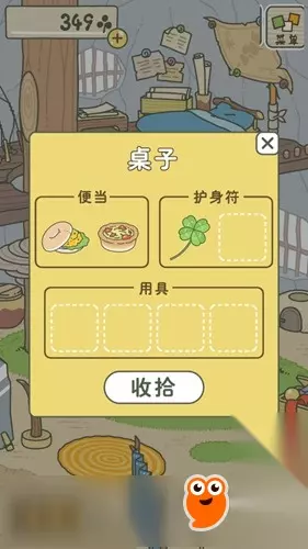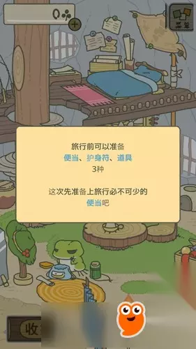 在青蛙旅行的时候,我们可以在屋里桌子上继续放东西,为下次旅行做好准备,这样青蛙回来后我们没有看到,它也会自己挑选桌子上的东西去旅行。 注意:东西放在桌子上后,点击右上角的“X”即可,不要点击下面的“收拾”按钮。