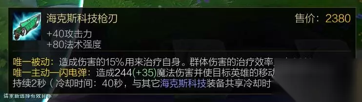 +40攻击力+80法强 唯一被动:造成伤害的15%用于治疗自身,群体伤害治疗效率只有33%。 主动:造成伤害并使目标减速。 卡特技能APAD双加成与科技枪的属性完美契合,而其至关重要的吸血属性配合征服者让我们有着超强的续航能力,打团时残血参战打完满血也属于正常情况。而且科技枪极其平滑的合成路线,即使线上抗压也能慢慢把科技枪做出来。主动技能无论是补伤害还是用于减速留人都有着不错的效果。 核心属性:固定法术穿透