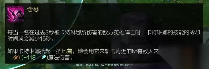 一、技能解析 改版前的卡特确实比较单调,连招基本都是固定的QEWR,很少情况下会有什么改变,可以说操作比较简单但装备成型后伤害爆炸,不需要多细致的操作也能玩好。新版卡特与老版卡特相比,虽然伤害并没有变低,但操作难度却高了很多,同时技能伤害也变的具有延时性。曾经有一个版本的妖姬,Q技能二段伤害需要1.5秒后才能触发,这意味无法瞬间打出伤害,给了对手足够的反应时间,英雄本身的容错率也低了很多。后来设计师似乎也意识到了这个问题,后续版本更新就把妖姬回调了。与妖姬不同,改版后的卡特可玩性却高了许多,首先来看技能。 贪婪(被动):如果卡特拾起一把匕首,那么她会斩击附近的敌人造成伤害(原W效果);击杀或助攻都将减少其他技能15秒冷却时间。