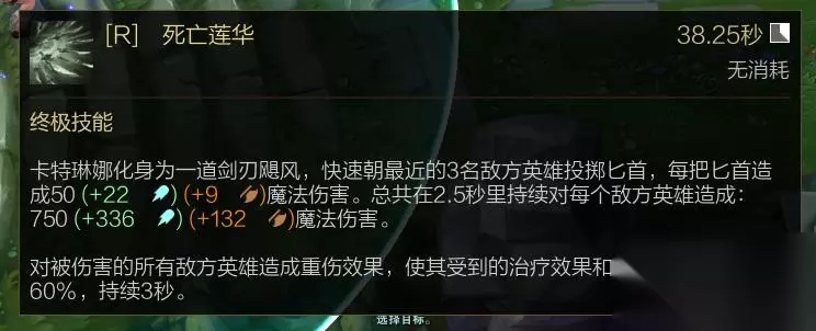 现版本卡特的E技能虽然不能摸眼了,但因捡匕首刷新冷却其灵活程度远超旧版卡特,利用E技能能闪烁到目标身边所有位置的特点可以躲避很多aoe伤害,E技能配合W可以用于翻越一些较薄的墙体。 死亡莲花(R技能):卡特的大招值得注意的点有两个,一是大招虽然看起来技能伤害超高,但想要造成全部伤害需要较长的释放时间,且释放过程容易被控制打断。第二是比较有意思的一个点,卡特的大招在正常情况下是灰色的,但如果有敌方英雄在技能范围内,那么技能会变成可释放的状态,图标会变亮,我们可以利用这个技能的特点得知附近是否有隐身单位,或者用于探草,也有着不错的效果。