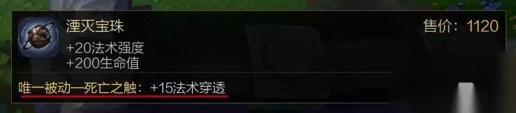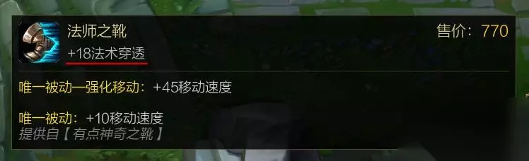 法师之靴+18法穿 泯灭宝珠+15法穿 目标魔抗越低固定法穿收益越高。如果在游戏中细心观察野区野怪我们可以发现,有的野怪魔抗或护甲为负值,比如红buff的魔抗为正常值,但护甲为-15,蓝buff的护甲为正常值,但魔抗为-15。前期在攻击力只有70左右一件初级打野刀的情况下平A就能对红buff造成120左右的伤害,所以一级时也能很轻松的收掉红buff,而一级时普通攻击对蓝buff只能造成90点左右的伤害。可以得知,目标抗性越低,固定穿透伤害收益越高,当目标的抗性达到负数时,伤害能达到100%以上。 除了战士坦克英雄以外,一般英雄的基础魔抗值与魔抗成长都很低。以寒冰为例:寒冰一级基础魔抗只有30.5,成长魔抗值为0.4,当到9级的时候,魔抗值也只有33。如果正常发育,寒冰9级的时候我们11级,装备出到科技枪,法穿鞋,泯灭宝珠,这时候固定法穿值也是33点,那么我们对寒冰的伤害基本等于真实伤害。 后续出装以法术强度装为主,可以根据情况选择帽子、法穿棒;保命装,女妖、金身等。