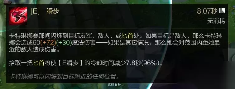 现在被动是卡特最主要的输出手段,想要打出足够的伤害就要保证被动的命中率,许多新手玩家认为现在卡特没有伤害的一个重要原因差不多都是被动打不到人,经常三个被动空两个,这样自然打不出伤害。在LOL中每个英雄的数值基本上都是比较严谨的,很少会出现数值爆炸的英雄,尤其是在前期属性差距不大的情况下,如果不利于好每一个输出手段就很难给对手造成威胁。 瞬步(E技能):卡特琳娜立即闪烁到目标处,造成伤害,拾取匕首能减少冷却时间,卡特琳娜能闪烁到目标身边的任何位置。