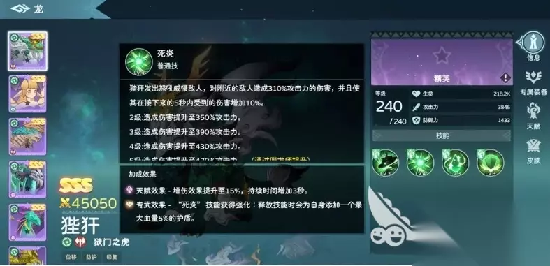狴犴详细的四维数据为,攻击力高达3845,暴击伤害更是达到了惊人的150%,防御力有1433,血量则厚实地达到了218200,在游戏中的定位是一个龙族战士,兼具一定的坦度和较高的输出能力,它的一技能侵袭堪称强力突袭神技,当主动触发时,狴犴会发出震天的嘶吼冲向目标区域,在冲锋的过程中,会对沿途所碰到的所有敌人造成总计三次打击,每次都能打出相当于自身240%攻击力的伤害。