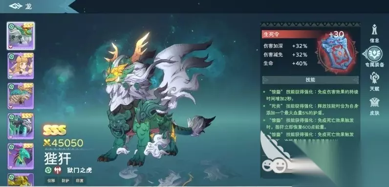 当然大家在使用狴犴进行战斗时,合理的站位至关重要,鉴于它是勇猛型的龙且拥有专属装备提供的免伤效果,理应将其放置在火力最为集中的前排位置,让它能够第一时间承受敌人的攻击并展开反击,关于专属装备的升级策略,如果有充足的资源,自然可以将之升至30级以获取全部强大效果,倘若资源有限,即便只升到1级也具有一定的价值,因为此时虽然提升的5%护盾效果不太明显,但关键的免疫死亡效果依然能够发挥重要作用,保障狴犴在战场上的生存能力。 关于遇见龙2狴犴怎么样的介绍就先介绍这么多吧,不管大家想要在游戏中使用狴犴这个神兽做什么,都要依据他的能力为基础哦,而且就目前大各个神兽来说,狴犴的效果绝对是属于比较强的一类,至少在伤害数值上面是可以依靠罪人的标记带来很大数值提升的,后期大家用狴犴也可以利用这一点带来强大的输出。
