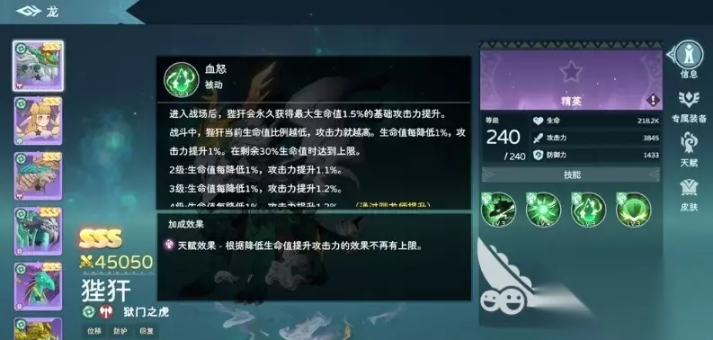三技能血怒则为狴犴赋予了独特的成长机制,自进入战场的那一刻起,它便会永久获得基于最大生命值1.5%的基础攻击力提升,而且在战斗过程中,狴犴的攻击强度还会随着自身生命值比例的降低而不断增强,具体来说生命值每减少1%,攻击力就会相应提升1%,当剩余生命值降至30%时,其攻击力将达到上限,此时的它在爆发力上面就展现了更惊人的效果。