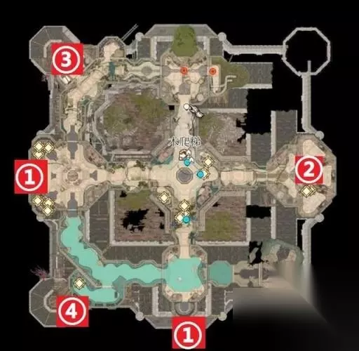 下图是囚牢的地图与相关人员位置: ①人质们(楼梯旁的除外) ②高公爵 ③夺心魔 ④一些宝箱