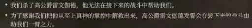 如果高公爵得以存活,玩家可以通过对话让君主也“顺便”保护他,从而让他加入营地,了解到对应危机的“另一种办法”。