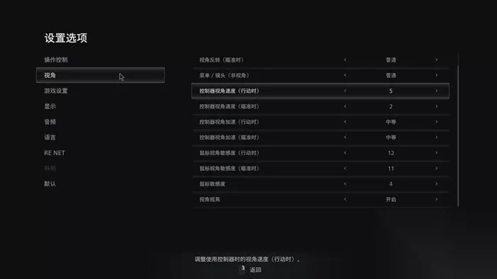 生化危机8和生化危机7相同,都是采用的第一视角进行游戏,这也让游戏的恐怖氛围营造上升了一个台阶,而且在某种程度上来说也是加大了游戏难度。而不少玩家想要将视角设置为第三人称或者是之前的过肩视角。游戏中对视角的调整仅是局限于视角方式以及视角速度、敏感度方面的调节,无法切换第一人称以及第三人称视角。