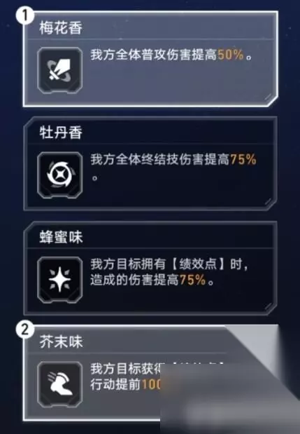 二、气味插件选择:梅花香和芥末味。 解析:梅花香提高了队伍的普攻伤害,可以提高队伍的斩杀线。芥末味可以在夺取绩效点之后提升全队的行动条,让你可以更好的进行输出。