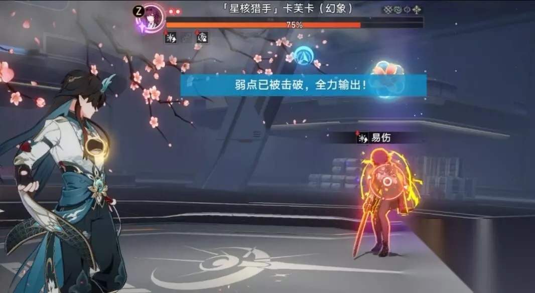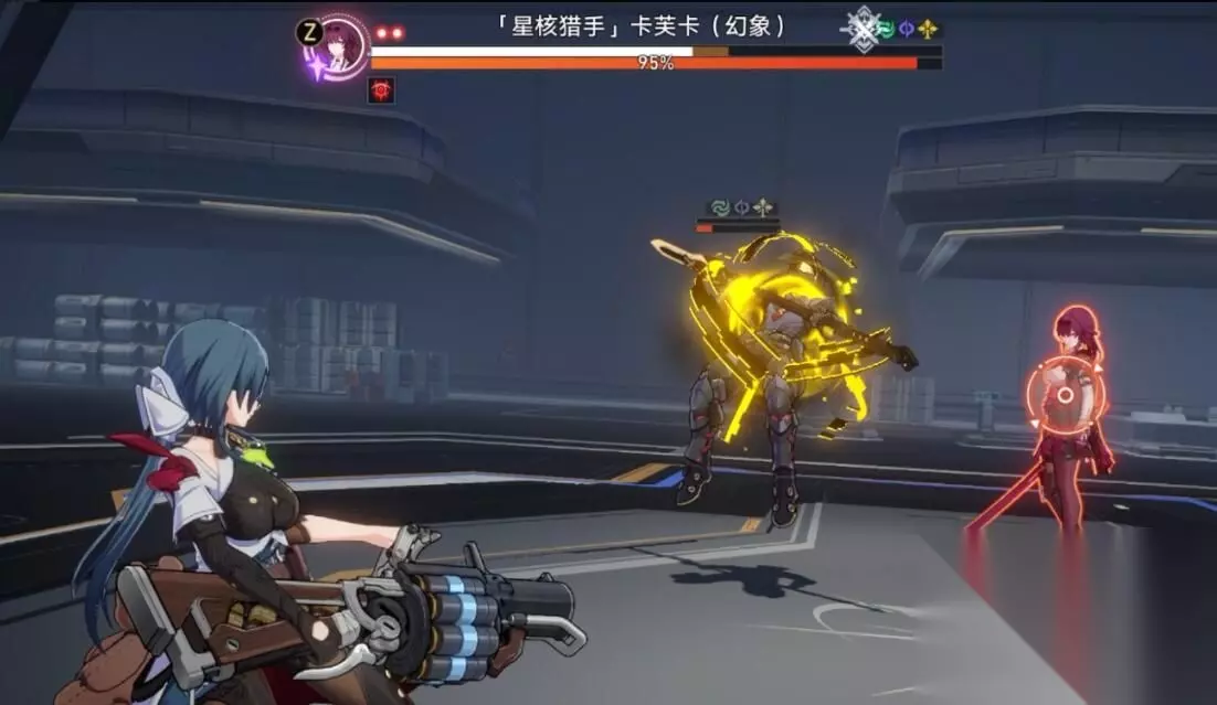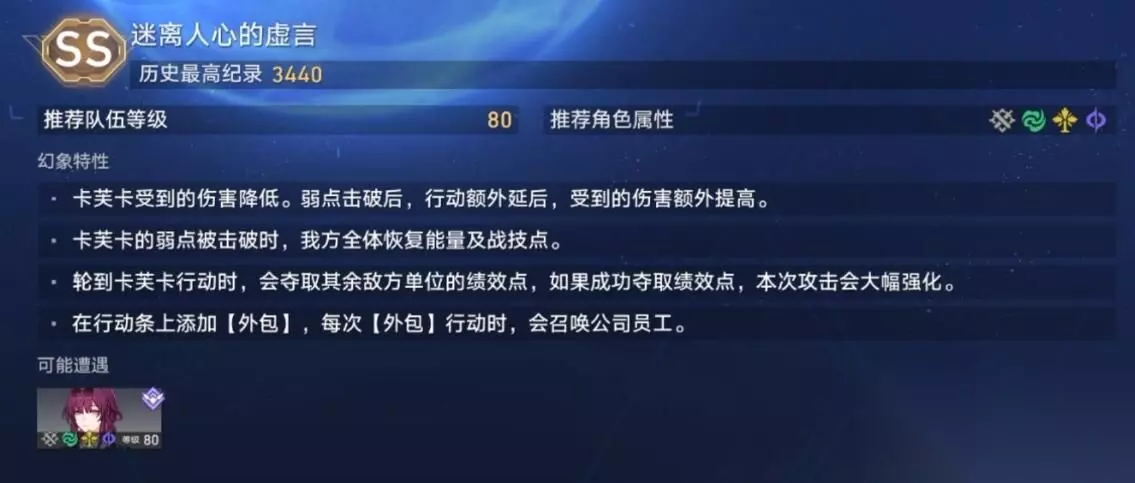 三、敌人特性: 主要机制: 1、每隔一段时间场上会召唤公司员工小怪,玩家击破其弱点就可以夺取绩效点。 2、击破卡芙卡的弱点时,对其施加易伤状态,回复我方全体的能力,并且回复3个战绩点。 四、打法: 1、饮月强化普普攻到两级后平A。