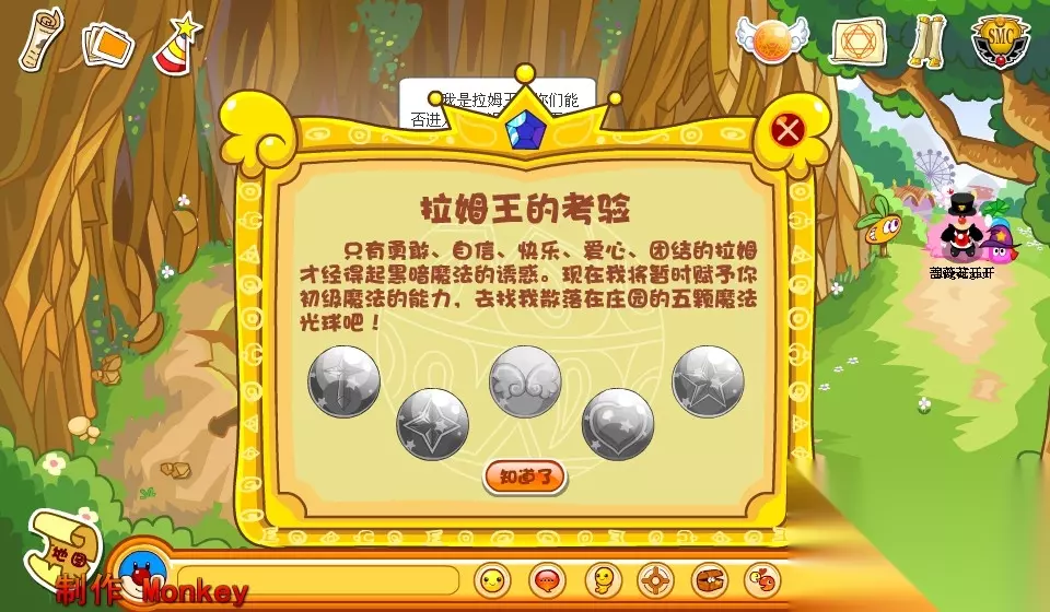 摩尔庄园拉姆王的考验怎么完成: 一、接受任务: 首先需要找到拉姆王或相关NPC角色,在对话中接受拉姆王的考验任务。NPC角色会告诉考验的目标和规则。 拉姆王的考验任务,需要找齐五颗魔法光球。 二、五颗魔法光球: 1、勇敢光球——危险的黑森林(前哨战): 第一颗魔法光球:勇敢光球——危险的黑森林,是在前哨战。我们来到前哨战就可以看到一只老鹰,点击对话后选择自由魔法,点击自由魔法球,出现魔法棒,点击老鹰。 2、自信光球——小拉姆的考试(拉姆课堂): 第二颗魔法光球:自信光球——拉姆的考试,在拉姆课堂。来到拉姆学院的拉姆课堂,点击对话沮丧的小拉姆。选择鼓励魔法,点击鼓励魔法球,出现魔法棒,点击小拉姆。 3、快乐光球——雪山最高处(摩尔拉雅雪山山顶): 第三课魔法光球:快乐光球——雪山最高处,在雪山顶。在雪山顶帮助拉姆爷爷找到鱼竿,选择亲情魔法球。 4、爱心光球——小动物最多的地方(阳光牧场): 第四颗魔法光球:爱心光球——小动物最多的地方,是在阳光牧场。点小猴子,选香蕉魔法。 5、团结光球——消防队员(消防署): 第五颗魔法光球:团结光球——消防队员,在消防署。点击坐在地上的小拉姆,选择多人魔法球。