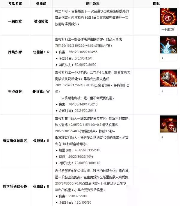 英雄属性 生命值:390(+80/每级) 魔法值:250(+50/每级) 移动速度:330 攻击速度:0.65(+1.7%每级) 护甲值:12(+3.3/每级) 魔法抗性:30(+0/每级) 攻击距离:575 生命回复:1.05(+0.12/每级)/秒 魔法回复:1.35(+0.12/每级)/秒 使用技巧 自己使用 即使远离团战发生地,你也可以在远处用【R科学的地狱火炮】来帮助队友。 用【E海克斯爆破雷区】来减速你的敌人,会使你的其它技能更易命中。 用【W定点爆破】来穿墙,可以在追杀或逃命时如虎添翼。 敌人使用 别踩到吉格斯的地雷上!它们会使你减速,并且会让吉格斯的其它技能更易命中你。 吉格斯的很多技能冷却时间都很长。可以在他刚用过技能时发起攻击。 吉格斯的大招,科学的地狱火炮,会在爆炸的中心区域造成更多伤害。