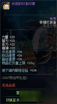 七、侦探的怀表印章 作为今年劳动节的产物,属性也是雷打不变的四维20、5%三速和10kg负重,亮点在于地下城内刷怪经验+50%,在90版本开放不久的现今,有很多玩家的号都还没有满级,50%的经验入账对于升级这点来说还是很好的。