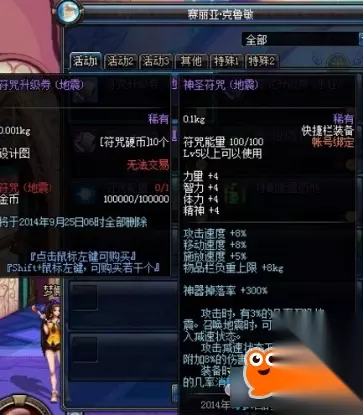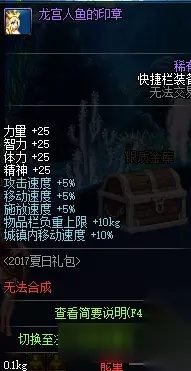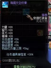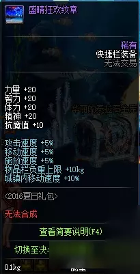 六、盛情狂欢纹章 这个纹章是去年夏日礼包的产物,20点四维、5%的三速、10kg的负重,城镇移动速度+10%,看上去比以前礼包中的纹章稍微强一点了,而当时最大的卖点抗魔值+10,在装备改版后,就直接报废了。