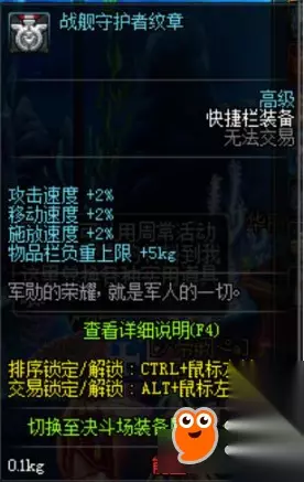 二、战舰守护者纹章 这个也是通过任务可以获得的纹章装备,完成《拯救航空母舰、安图恩支援告急》的任务你就可以获得该纹章 2%的三速虽然现在看起来蚊子腿,但毕竟是送的,胜在免费,而且早期+5kg负重这条属性也是算相当不错的了。