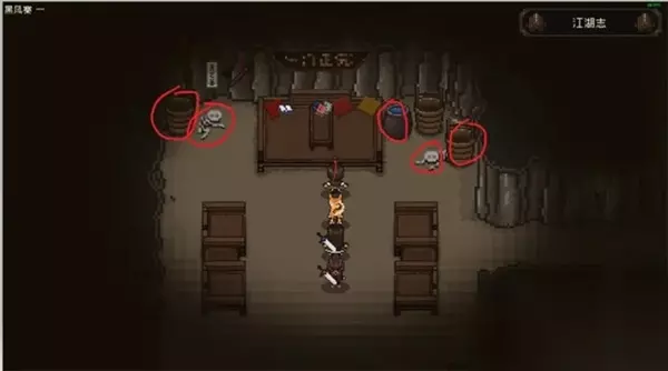 进入渡口后的挑战 继续前进,在酒店门口,黑衣女子会加入队伍。打完鸡之后,可以在上方的木桶里捡到一些道具。 此时如果道德小于5,杂货店小童会开启隐藏商店。 酒楼战斗与队伍变化 进入酒楼后,发生一场战斗。根据选择的分支,你将获得不同的奖励。我选择了江湖线,战斗胜利后,获得了一些武学,并让王与林离队,迎来了新的队友上官楠。