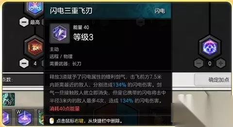 闪电三重飞刀加到3!这个技能在雷属性作用下伤害提升显著,附带弹射意味着这个技能大大增加了闪电三重飞刀在清怪时的效率,作为雷电属性符文剑士的远程攻击手段还是相当不错的,不过该技能释放时间较长且能量消耗较高,所以不建议岛民小伙伴频繁使用。