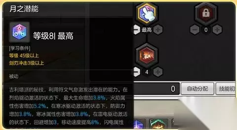 月之潜能必须加满!这个被动技能可以增加电属性伤害5.2%,虽然单次增益伤害不高但对于雷属性剑士这个多段次攻击的职业来说效果还是相当不错的,并且额外增加8%的移动速度,这就可以让雷属性符文剑士更加的灵动以便躲避敌人的攻击。