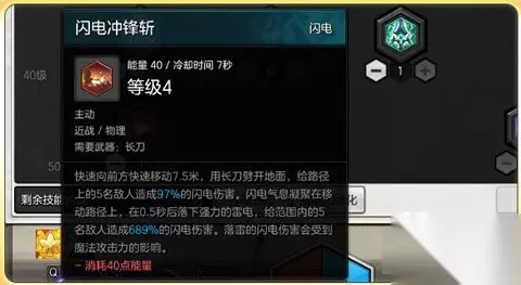 闪电冲锋斩加到4!由于等级的限制导致只能加4点,不过在雷属性的作用下这个技能伤害整体大幅提高,但是这个技能是2段伤害且有0.5秒施法延迟,在攻击范围方面也很有限,在释放时需谨慎使用。
