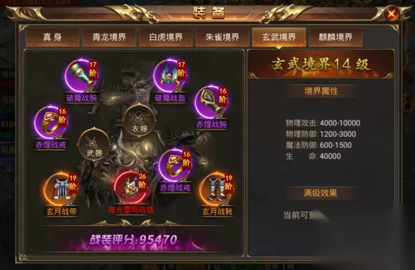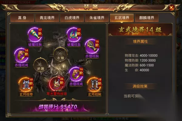 【玄武境界说明】 1) 角色等级达到500级开启玄武境界。 2)玄武境界可以穿戴27阶战装。 3)可使用玄武魂魄来提升玄武境界等级,等级越高可穿戴的战装阶数越高。 4)玄武境界等级上限为14级,可穿戴40阶战装。 5)可通过帮会商城、合成系统来获取玄武魂魄。